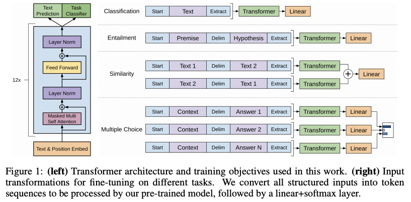 - Question Answering and Commonsense Reasoning: context document z와 question q, 가능한 답변 set이 주어지고 document context와 question을 delimiter token을 사용해 각 답변과 concat