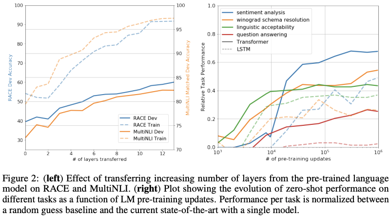 - 하단 왼쪽 그림은 MultiNLI와 RACE dataset에서 transfer된 layer의 개수에 따른 모델 performance에 대한 영향을 표현한 것