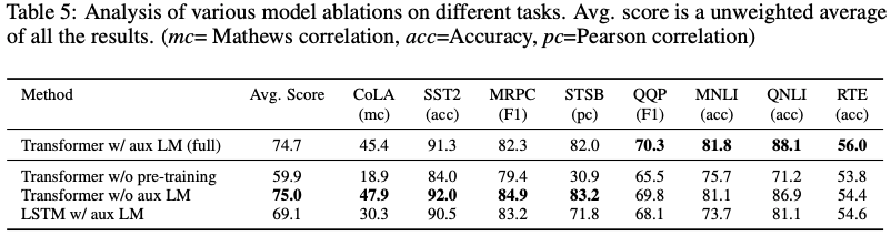 - 목적함수를 제거한 경우(=Transformer without aux LM), 성능이 오른 경우도 몇 있다는 점에서 큰 데이터 셋(=QQP, NLI, RTE)에서는 성능 향상에 도움이 되지만 작은 데이터 셋에서는 아님을 알 수 있음