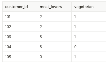 SELECT customer_id, SUM(CASE WHEN pizza_id = 1 THEN 1 ELSE 0 END) AS 'meat_lovers', SUM(CASE WHEN pizza_id = 2 THEN 1 ELSE 0 END) AS 'vegetarian' FROM pizza_runner.customer_orders_temp GROUP BY customer_id ORDER BY customer_id;