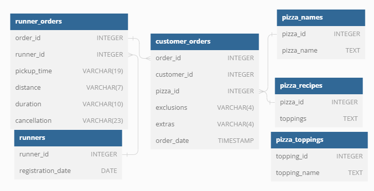 Customer pizza orders are captured in the customer_orders table with 1 row for each individual pizza that is part of the order.The pizza_id relates to the type of pizza which was ordered whilst the exclusions are the ingredient_id values which should be removed from the pizza and the extras are the ingredient_id values which need to be added to the pizza.