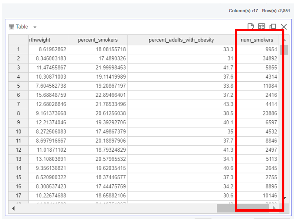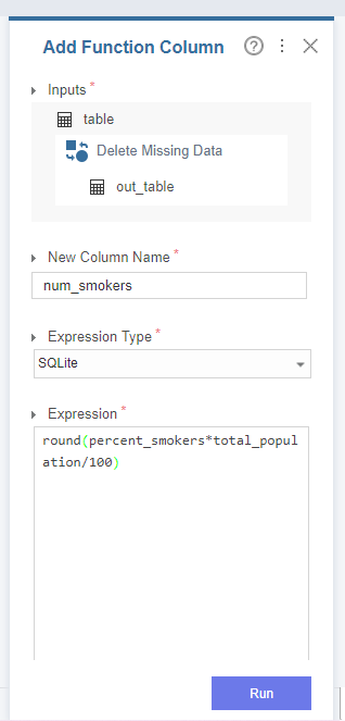 Add Function Column 을 통해 직접 흡연자 수를 계산한 num_smokers 열을 만들어주었어요.