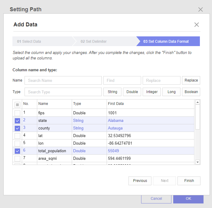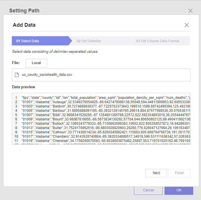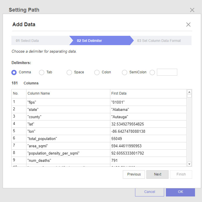 delimiter는 콤마로 선택해준 다음, 원하는 데이터 칼럼을 선택합니다.