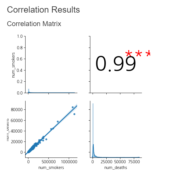이로써 흡연과 코로나로 인한 사망 간의 관계는 아주 높은 상관관계를 갖고 있네요!