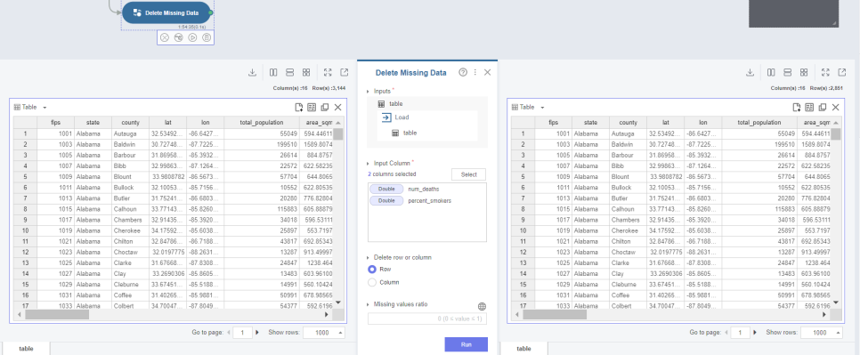 저는 Delete Missing Data 함수로 null 값을 가진 row를 모두 삭제해주었어요.