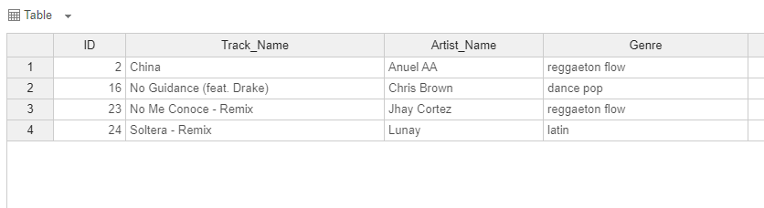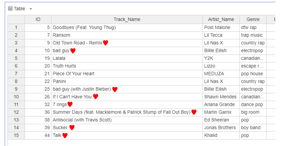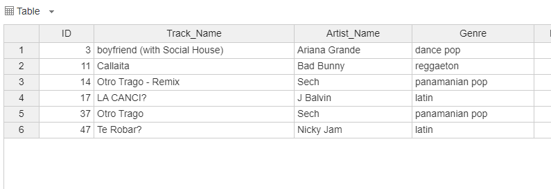 | Track.Name | Artist.Name | Genre | Beats.Per.Minute | Energy | Danceability | Loudness..dB.. | Liveness | Valence. | Length. | Acousticness.. | Speechiness. | Popularity |