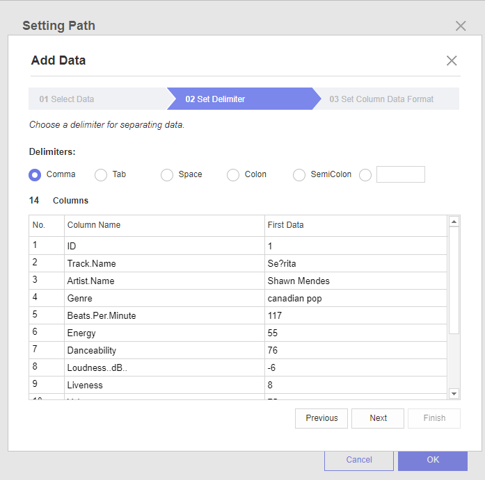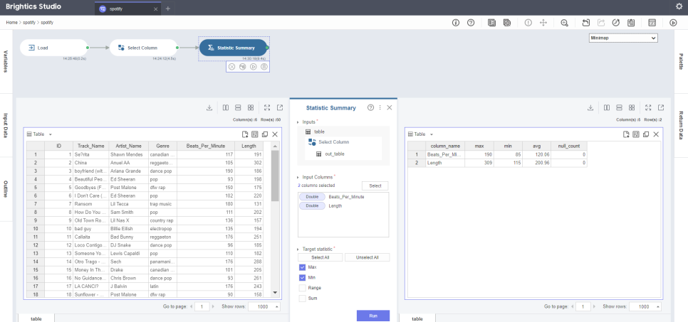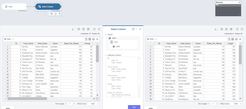 변수가 id를 포함해서 모두 14개 였는데요, 이 중 Beats.Per.Minute(BPM) 과 Length(음원 길이)에 따라서 나누어보려고 해요! 이때 무슨 이유에서인지 LOAD 과정에서 칼럼이 선택이 안되던군요.