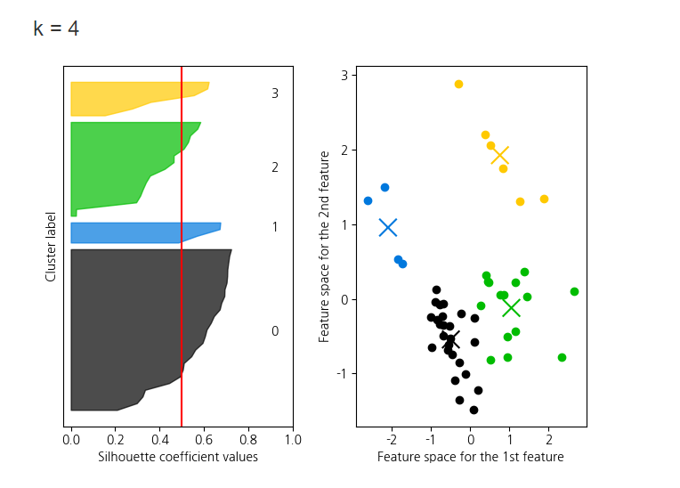 그 결과, 4개의 군집을 형성하면 실루엣 계수의 평균이 높게 나타나고 있었습니다 !