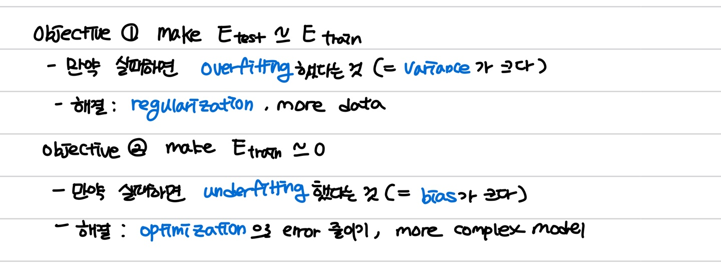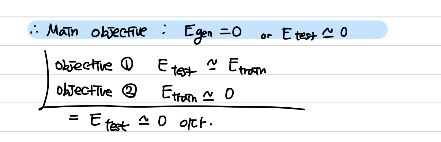 그리고 이를 다른 말로 풀어써보자면, 만약 성능측정의 지표로 error rate을 사용한다고 했을 때, E_gen(=train에 사용하지 않은 이외의 모든 data들) = 0 이 됐을 때를 목표로 한다는 것이다.