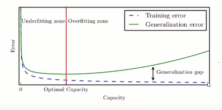 ※ 여기서 잠깐 그래프 안에 capacity라는 말이 등장하는데, 모델의 capacity라고 함은 모델의 복잡성을 말하는 것이다. 모델이 얼마나 다양한 함수와 fit될 수 있는지를 알려주고, 이는 즉 overfitting과 underfitting함을 가리는 기준이 된다.