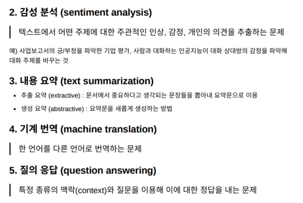 1) 텍스트 분류, 2) 감성분석 ,3) 내용요약, 4) 기계번역, 5) 질의응답 등이 있다.