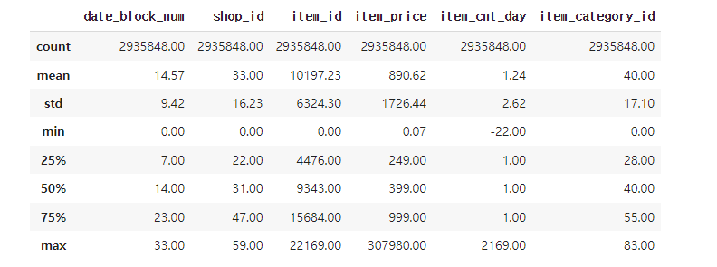 | date_block_num | 편의를 위한 월 번호. 2013년 1월 :0, 2013년 2월 :1,,,,,,,, 2015년 10월: 33 |