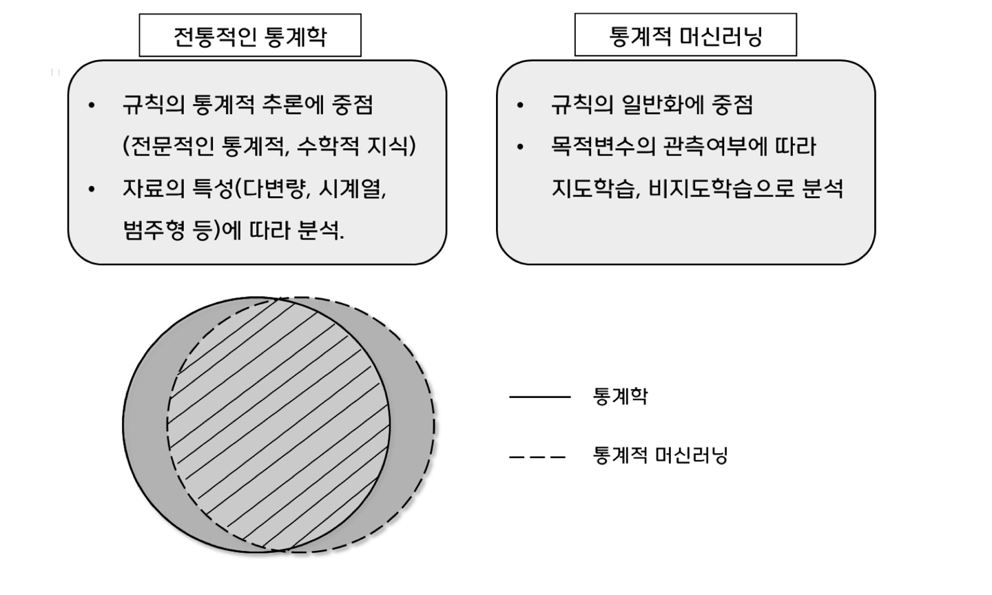 03. 머신러닝 vs 전통적인 통계학 vs '통계적' 머신러닝 사실 머신러닝에 대해 배울 때 꼭 짚고 넘어가야 할 부분이 바로 머신러닝 vs 전통적인 통계학 vs '통계적'머신러닝이다. 통계를 왜 배우는가, 통계가 머신러닝과 어떤 연관이 있는가. 먼저 머신러닝 방법과 전통적인 통계학은 그들의 목적에서 차이가 있다. 머신러닝 방법은 특정한 분포나 가설을 통해 실패할 확률(손실함수, 혹은 손실함수를 제곱합/평균낸 비용함수)을 최소화하는데에 목적이 있다. 이들의 목표는 바로 일반화(generalization)이고 이를 위해 오버피팅을 방지하는 '정규화(regularization)'과정을 거치거나 언더피팅을 방지하는 '최적화(optimization)'방법을 고민하게 된다. 따라서 모델이 갖는 신뢰도나 정교한 가..